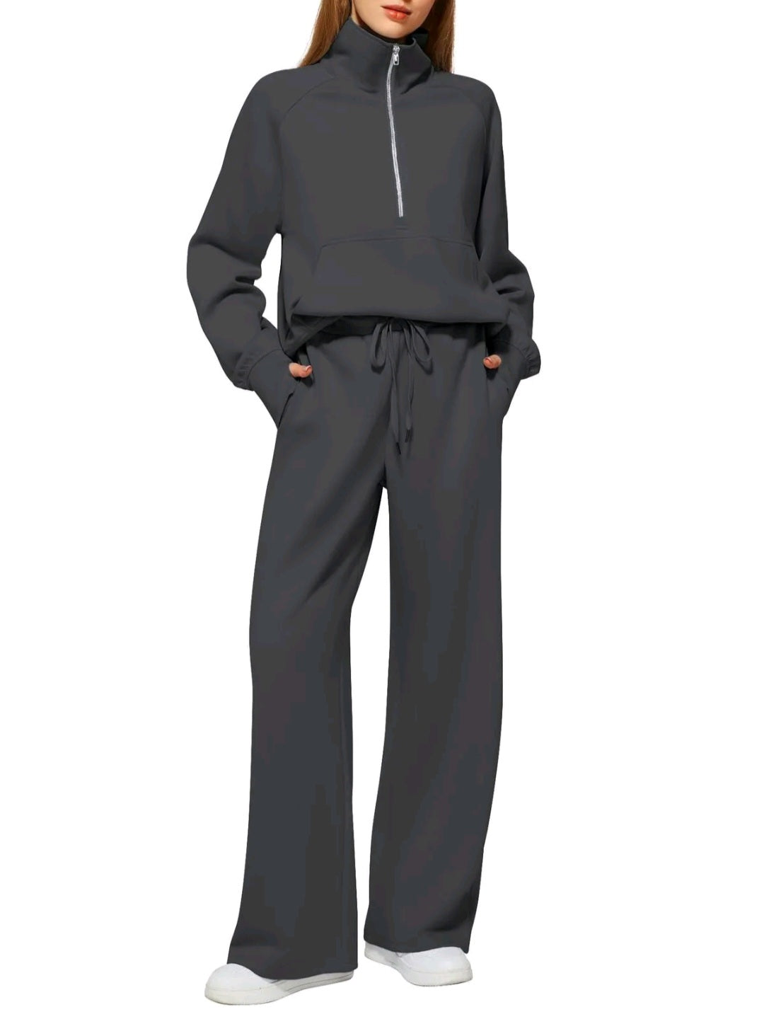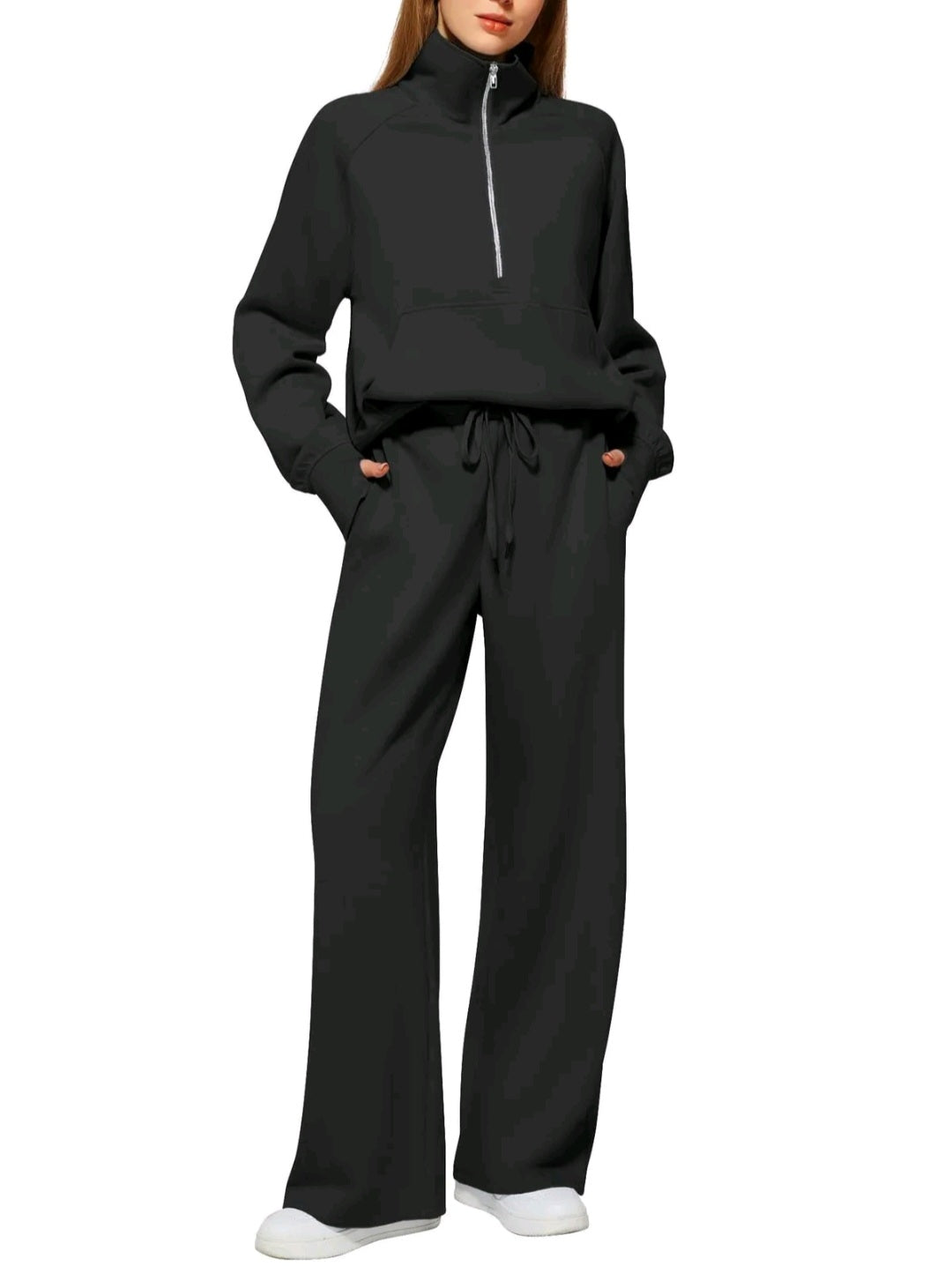 A stylish and comfortable two-piece set for everyday wear. Featuring a high-neck zip-up sweatshirt and wide-leg pants with an elastic waistband and drawstring, this outfit is perfect for casual outings, lounging, or streetwear looks.